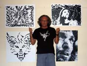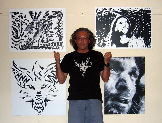 El maestro Agustí Soler (Agustisol) posando frente a cuatro de sus fantásticos dibujos. Podéis ver parte de su obra en la web http://mixilus.com/agustisoler. Observad sus dibujos de Angus, Bon y Cliff.