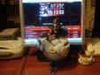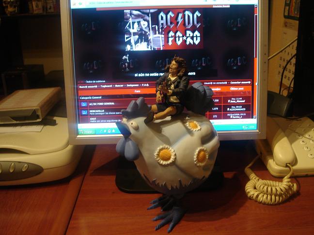 Nuestro compañero José Manuel (webmaster de la página Safe In Madrid City y coordinador de nuestro Foro) tiene delante de su ordenador a Angus montado en un pollo. Ah, miradlo durante la visita de Angus y Malcolm a Leganés, donde le firmaron un ejemplar del disco "Stiff Upper Lip".
