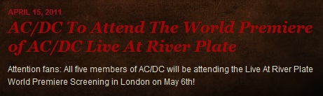 En la página oficial de la banda en Estados Unidos (http://www.acdc.com/us) se anuncia que los cinco miembros de AC/DC acudirán el 6 de mayo a Londres a la presentación del nuevo DVD/Blu-ray grabado en Argentina durante su última gira. Mirad la reseña que se anuncia en la web.