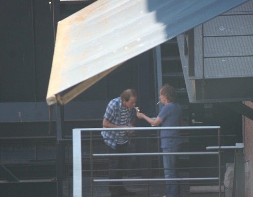 Si ayer veíamos la fotografía de Brian Johnson y Phil Rudd charlando amigablemente, hoy vemos a Angus Young y su sobrino Stevie Young fumando un cigarrillo en los estudios de grabación Warehouse Studios de Vancouver.