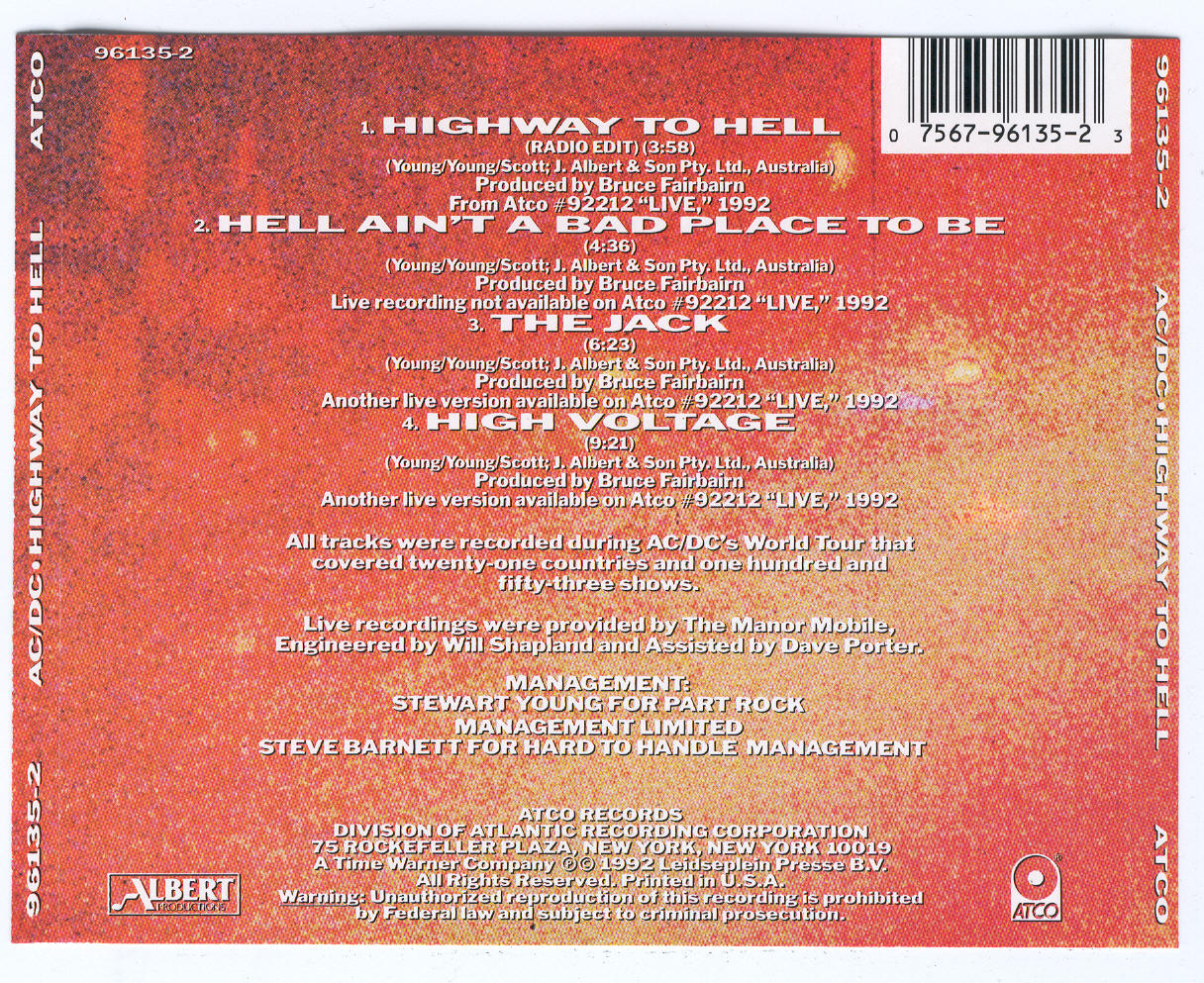 AC/DC Highway To Hell (CD Maxi Single) Portada - Contraportada 1. Highway To Hell (From "Live") 2. Hell Ain't A Bad Place To Be (Not available on "Live") 3. The Jack (From "Live") 4. High Voltage (From "Live")