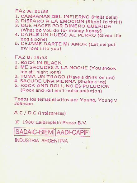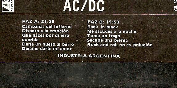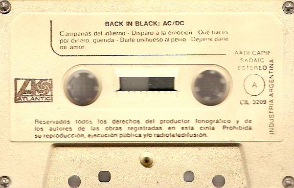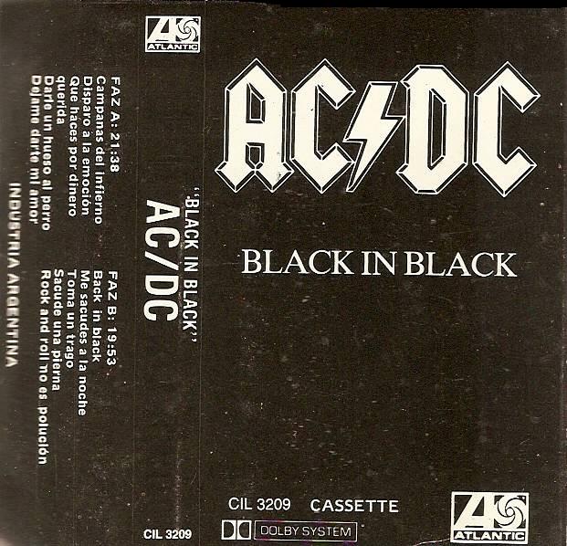 Cassette 'Back In Black' (1980). El título del álbum no ha sido modificado. Se han traducido todos los temas a excepción del que da nombre al disco.