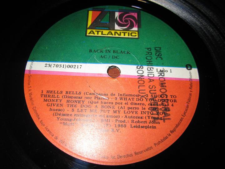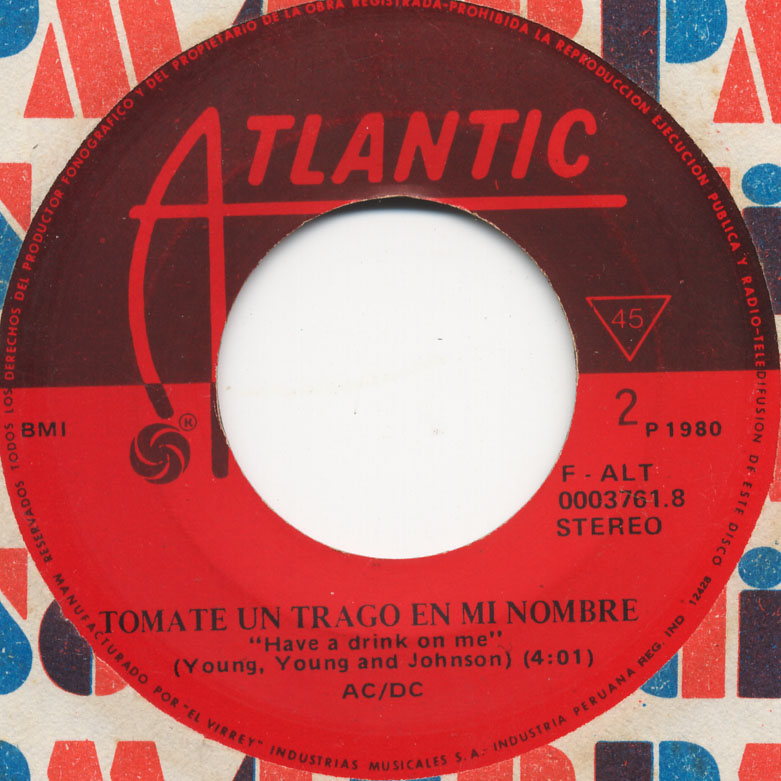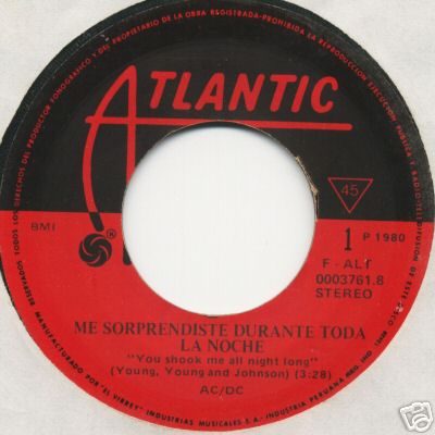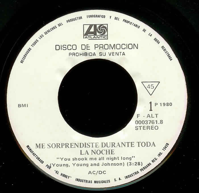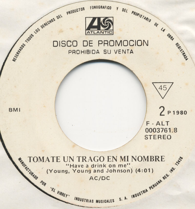 Single 7" 'You Shook Me All Night Long'/'Have A Drink On Me' (1980). 'Me soprendiste durante toda la noche'/'Tómate un trago en mi nombre'.