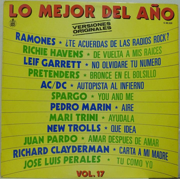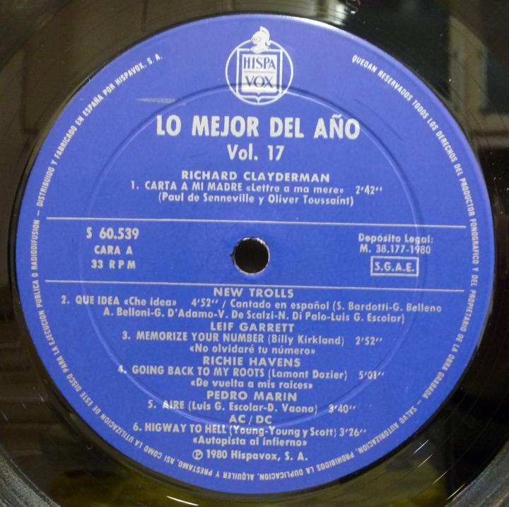 LP 'Lo Mejor del Año. Vol. 17' (1980). Álbum recopilatorio editado por HISPAVOX S 60.539. En la galleta del álbum está escrito el tema 'Higway To Hell' "Autopista al Infierno". (Falta la segunda 'H' en Highway).