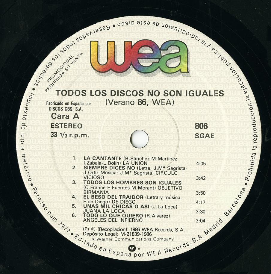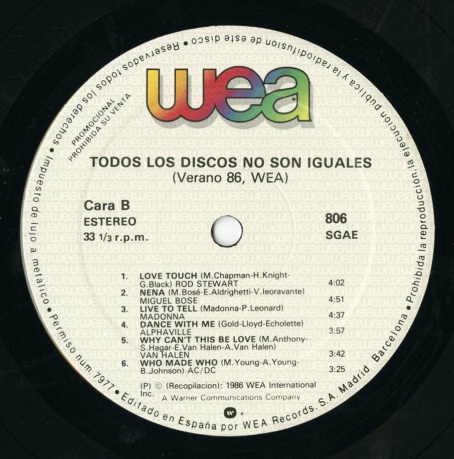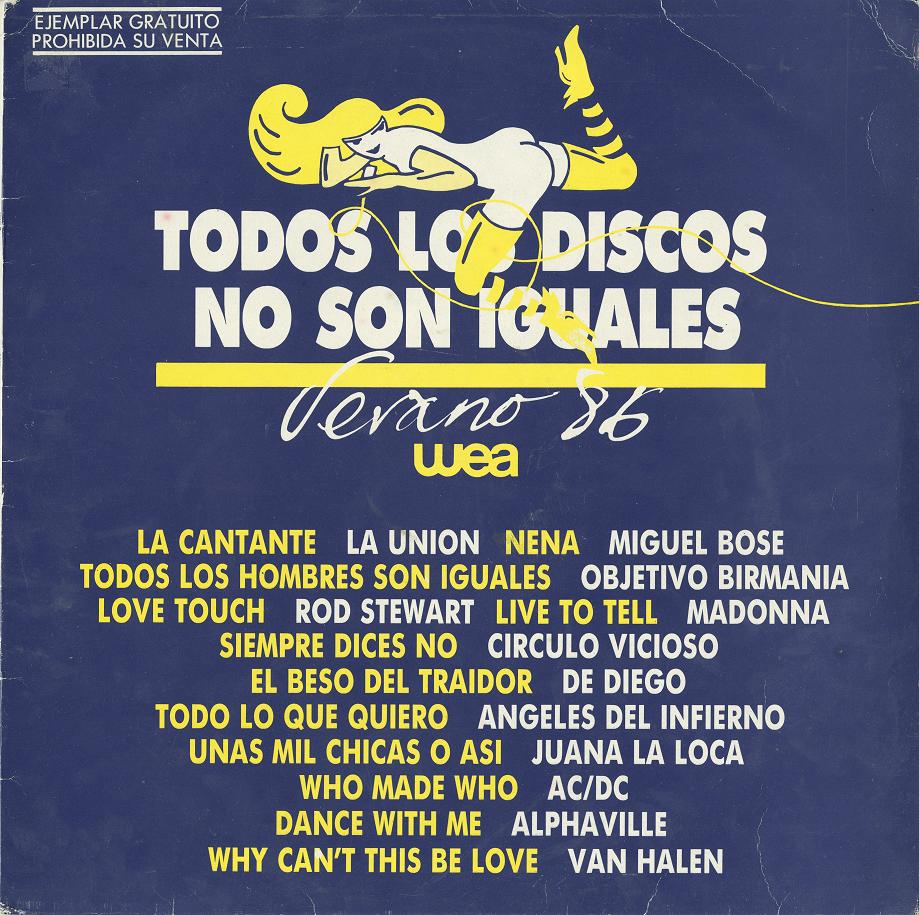 LP 'Todos Los Discos No Son Iguales. (Verano 86, WEA)' (1986). Disco recopilatorio con el tema 'Who Made Who'.