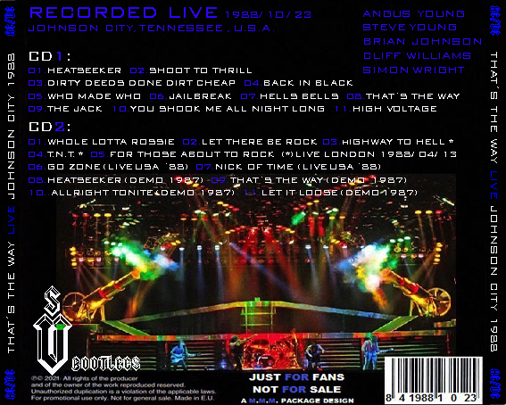La historia de esta grabación dice que fue el propio Steve Young quien pasó este concierto a un fan para demostrar como lo hacía en 1988. El concierto en sí, está incompleto, faltan los 3 temas de cierre. 'Highway To Hell', 'TNT' y 'For Those About To Rock'. Lo bueno de esta edición, es que vienen esos tres temas del concierto londinense de ese mismo tour, pero con Malcolm Young. Así podemos hacernos una idea de los shows de aquella gira. El bootleg se cierra con dos temas del BLOW UP YOUR VIDEO tocados muy pocas veces en directo; 'Nick Of Time' y 'Go Zone'. Y lo mejor está en el final. Varias demos de las sesiones de grabación del disco. Con Malcolm a la batería, Angus a la guitarra y Brian a la voz. Versiones ásperas y crudas de temas que acabaron siendo singles y otras que quedaron olvidadas en un cajón y nunca más se recuperaron.
