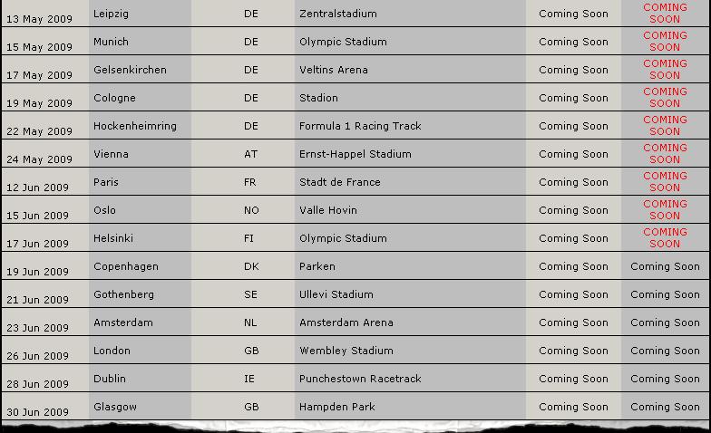 Las entradas para los conciertos de los meses de mayo y junio de 2009 a celebrar en estadios abiertos por Europa se están vendiendo a velocidad de vértigo.