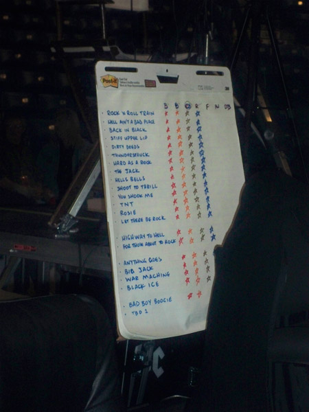 Parece ser que realizaron un show de 80 minutos e interpretaron la mayoría de sus clásicos, incluyendo los temas 'Rock 'N Roll Train' y 'Black Ice' de su nuevo disco. Los temas escogidos para el concierto fueron una selección de los que interpretarán en el resto de la gira. Un listado con los temas que parece ser interpretarán en sus conciertos estaba colgado cerca del escenario principal.