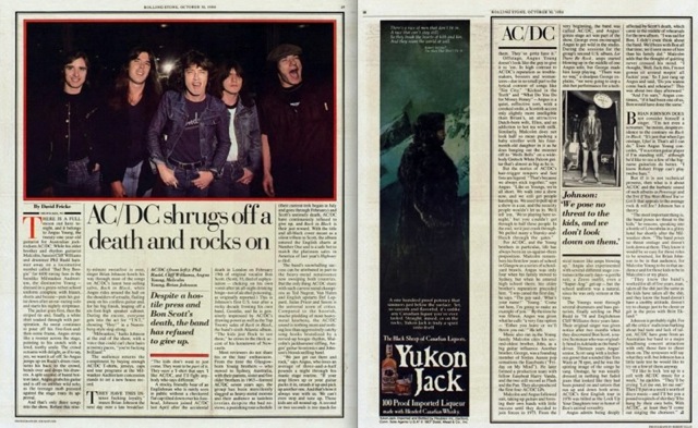 Johnson, un achaparrado y simpaticón inglés que raramente se deja ver sin una gorra de cuadros, se unió a AC/DC en abril de 1980 tras la muerte accidental en Londres, el 19 de febrero, del vocalista original Bon Scott (Scott, de 33 años, murió asfixiado en su propio vómito después de una noche de juerga con exceso de alcohol). Ésta ha sido la primera gira americana de Johnson, tras una década rockera liderando su propia banda, Geordie, y está verdaderamente impresionado con el poder de atracción de AC/DC, así como con la entrada en la lista de los más vendidos de Back in Black, el sexto álbum del grupo con la compañía Atlantic. "Los chicos vienen en tropel a verlos", alardea con un fuerte acento de su Newcastle natal.
