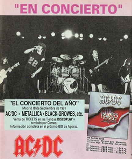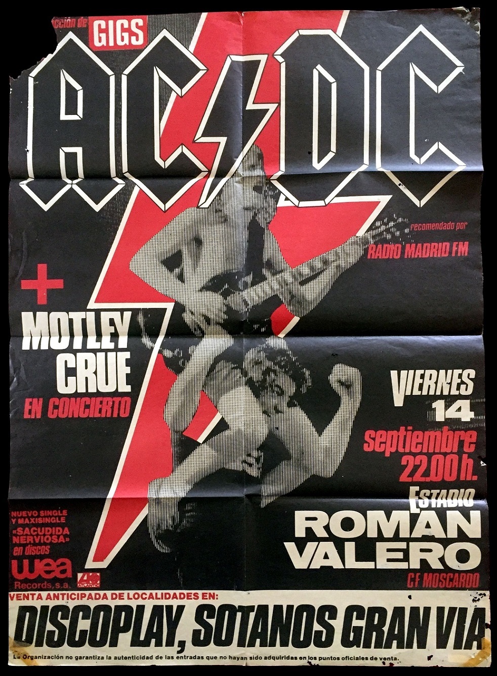 - CARTEL BARCELONA - CARTEL MADRID. Carteles de los conciertos suspendidos en Barcelona y Madrid en 1984 dentro de la gira del álbum Flick Of The Switch. La única fecha en España correspondiente a esta gira fue celebrada en San Sebastián el 11/08/1984.